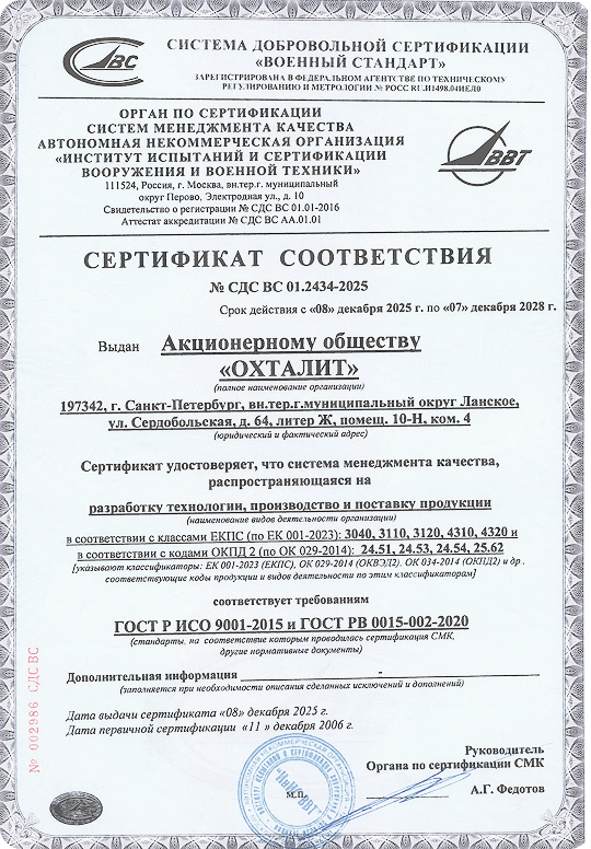 Удостоверяет, что система менеджмента качества распространяющаяся на разработку технологии, производство и поставку продукции соответствует требованиям ГОСТ Р ИСО 9001−2015 и ГОСТ РВ 0015−002−2020.