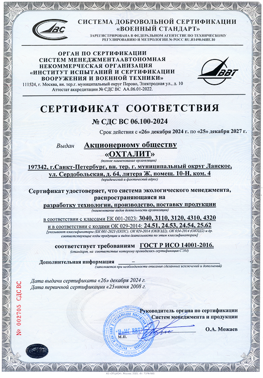 Удостоверяет, что система экологического менеджмента, распространяющаяся на разработку технологии, производство и поставку продукции соответствует требованиям ГОСТ Р ИСО 14 001−2016.